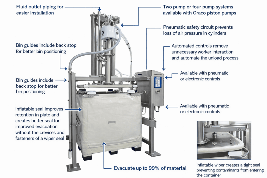 The Graco Bin Evacuation System is engineered to remove viscous and hard-to-pump materials directly from 300-gallon disposable or stainless bins. The system uses a pneumatic ram to lower a plate with wyper or inflatable seal, creating an airtight seal that wipes product from the container walls as it descends. This pressure forces material toward the pump inlet, where a Graco diaphragm, piston, or ram-mounted pump transfers product smoothly to downstream processes. Because the follower plate maintains constant contact and uniform pressure, the system eliminates trapped air pockets, reduces waste, and ensures continuous, controlled product flow. The result is up to 99% evacuation efficiency, cleaner changeovers, and precise handling of thick products such as peanut butter, creams, frostings, lotions, syrups, and other high-viscosity formulations.