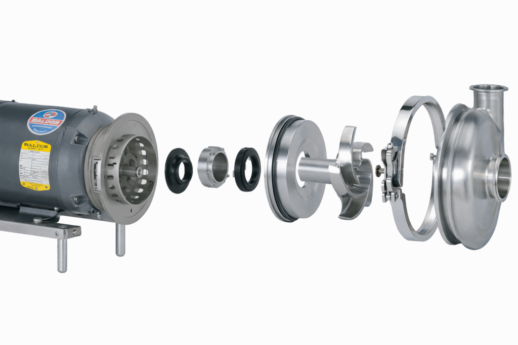 A centrifugal pump operates by converting mechanical energy from a rotating impeller into kinetic energy within the pumped fluid. In sanitary centrifugal pumps such as those from Waukesha and APV, fluid enters the pump through the inlet eye at the center of the impeller. As the impeller rotates at high speed, centrifugal force accelerates the fluid radially outward along the impeller vanes, increasing its velocity.